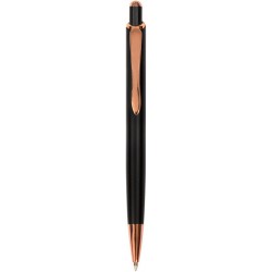 Bolígrafo Metal. Cuerpo de aluminio, rubber finished color negro, muy suave al tacto. Bolígrafo retráctil. Clip, puntera y detalles metálicos color cobre. Tinta azul. Decapa color plata.