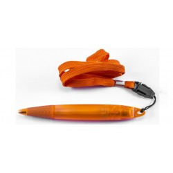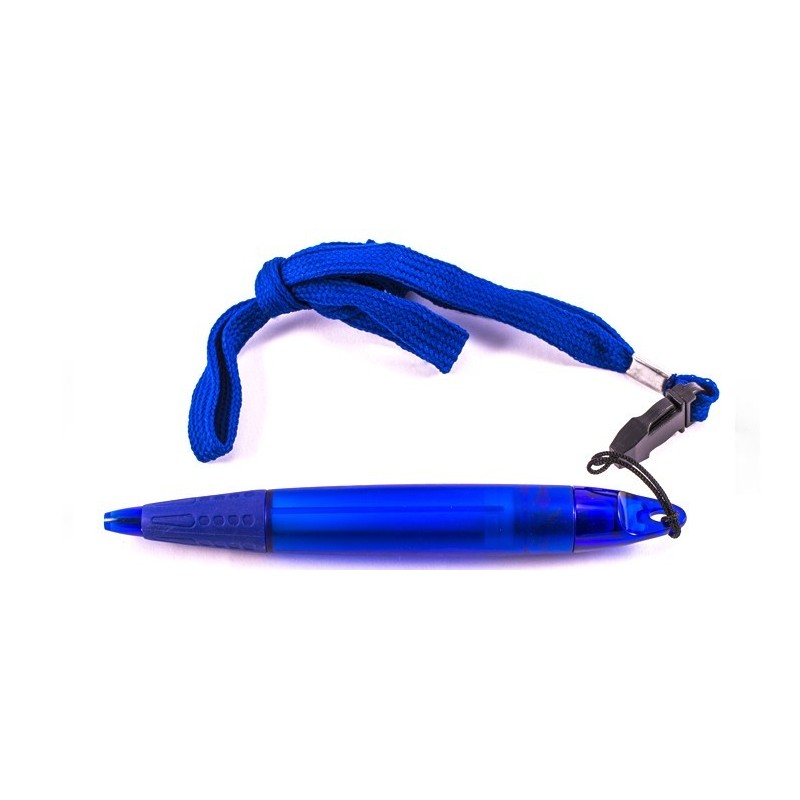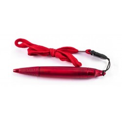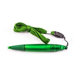 Lápiz acrílico translucido, con aplicación de goma en empuñadura, colgante desmontable y pulsador giratorio. Colores: Azul, Rojo, Verde, Blanco, Naranjo y Negro