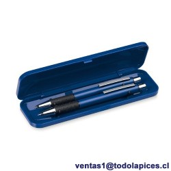 Set de bolígrafo de mecanismo pulsador y portaminas en atrevido diseño bicolor. De cuerpo acabado en suave aluminio de vivos colores, con cómoda y suave empuñadura y presentado en resistente estuche individual a juego. Bolígrafo de tinta azul y portaminas con minas de 0,7mm incluidas.